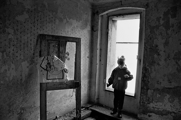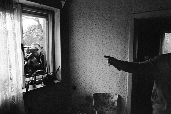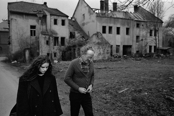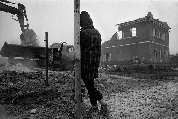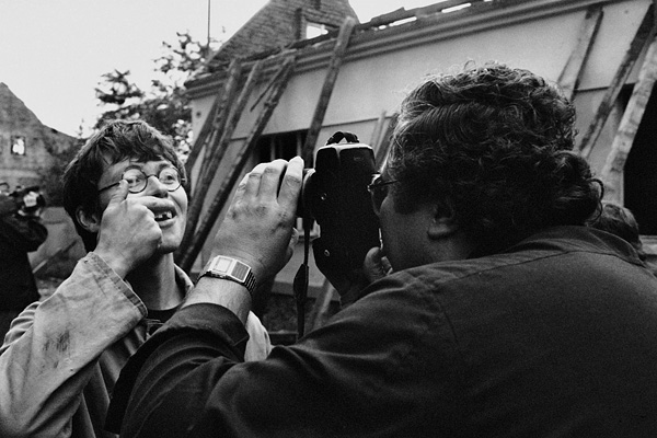 Jana Piňose fotografuje Libor Zaoral po sporu s bourači na domě ve Školní ulici / Libkovice 09/1993