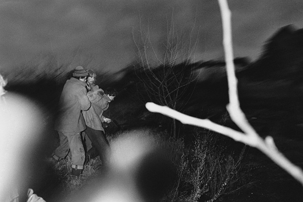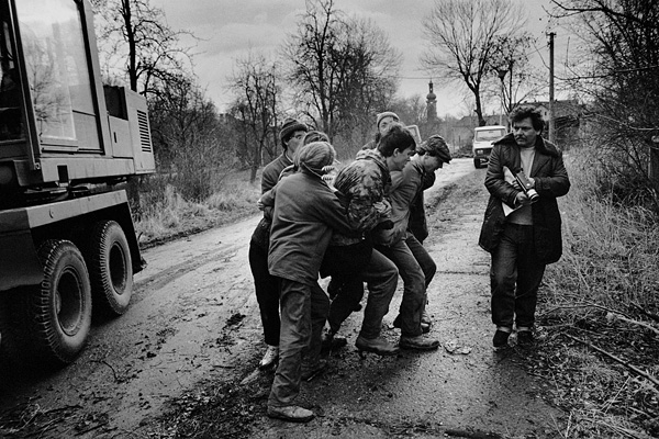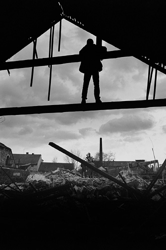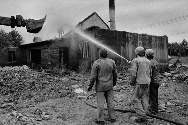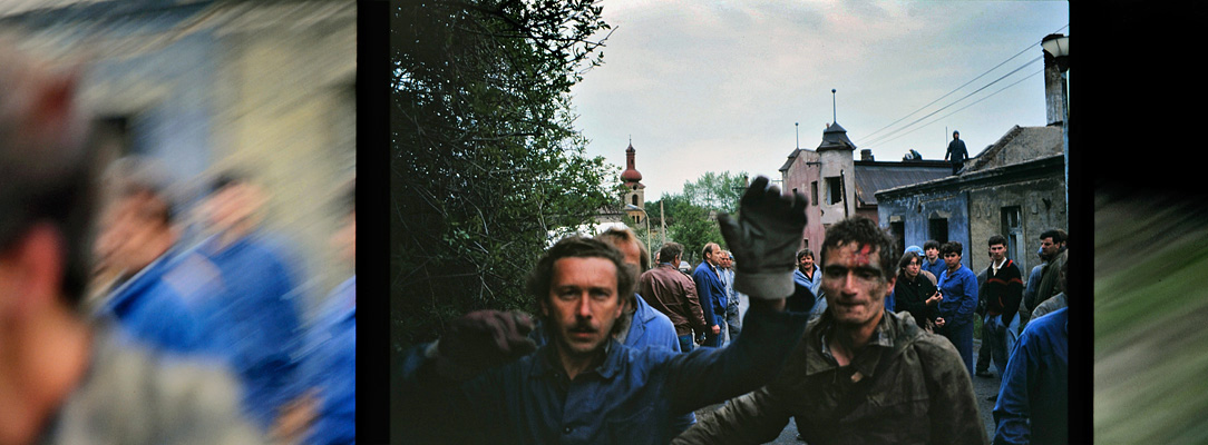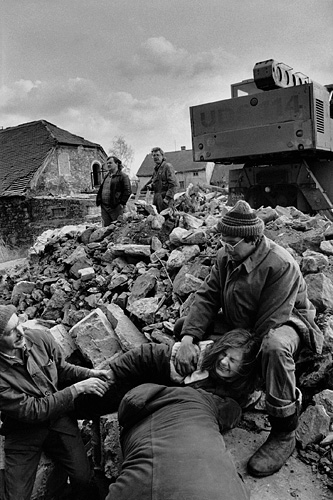 Dělnící vytáhli Petra Vozáka ze sutin, chtěl jsem jej vyfotit, ale napadli mne přivolaní bánští záchranáři a pokusili se osvítit mi exponované filmy / Libkovice 5. května 1993
