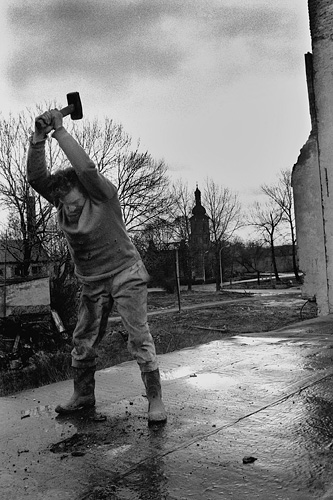 Místní František Flídr vybourává železnou traverzu / Libkovice 01/1994