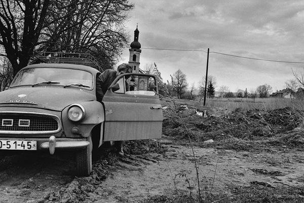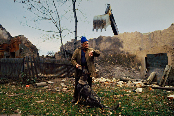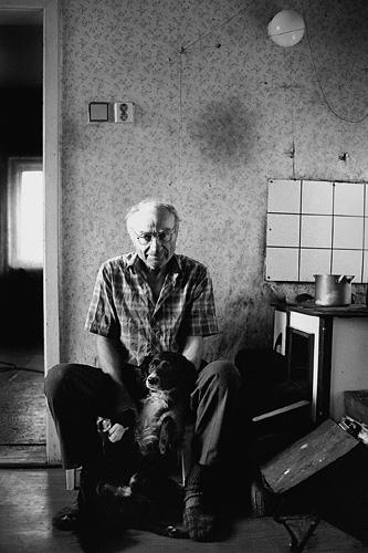 Karel Krejčí se psem Punťou ráno před úředním vystěhováním / Libkovice 21. října 1994