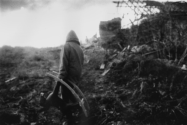 Daniel Vondrouš z Hnutí Duha brání stodolu v ulici Na hrázi / Libkovice 01/1993